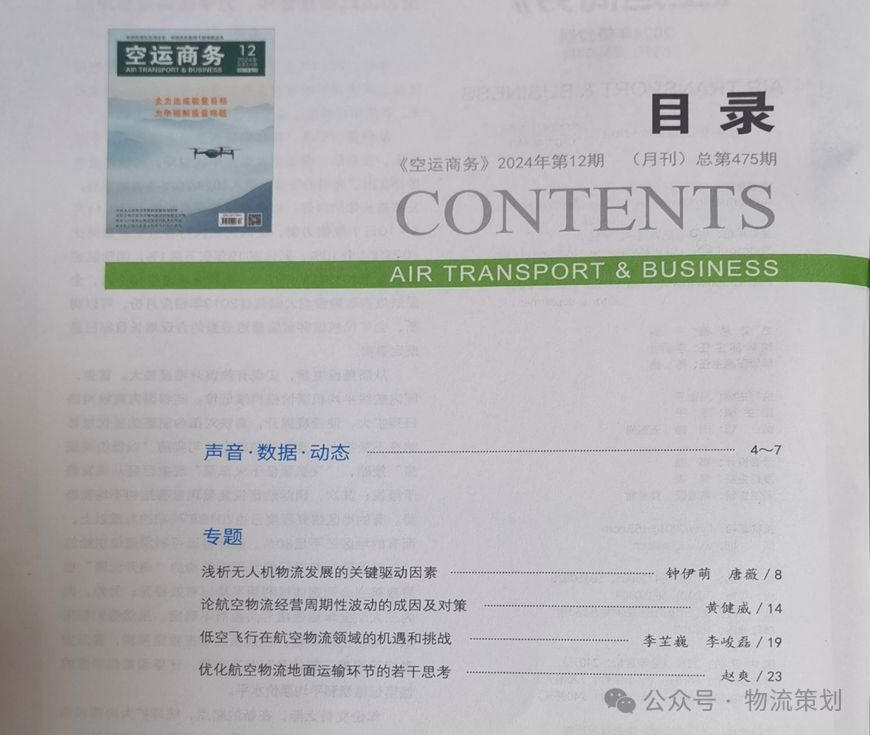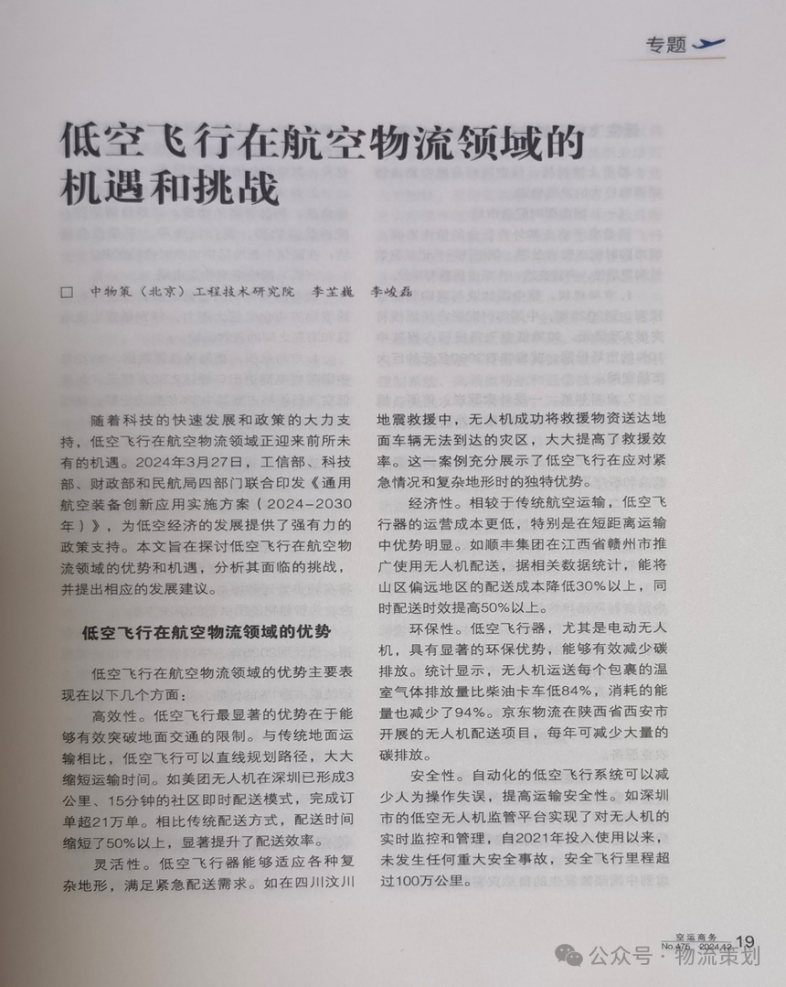 《空运商务》部级期刊2024年12月第475期推出中国物流与供应链智库优秀学术成果,李芏巍.李峻磊【低空飞行在航空物流领域的机遇和挑战】一文,这是一篇探讨低空飞行技术在航空物流领域应用及其所面临问题的研究论文,旨在推动航空物流行业发展的学术成果,为低空飞行在航空物流领域的应用提供有力支撑。(全文有删减)